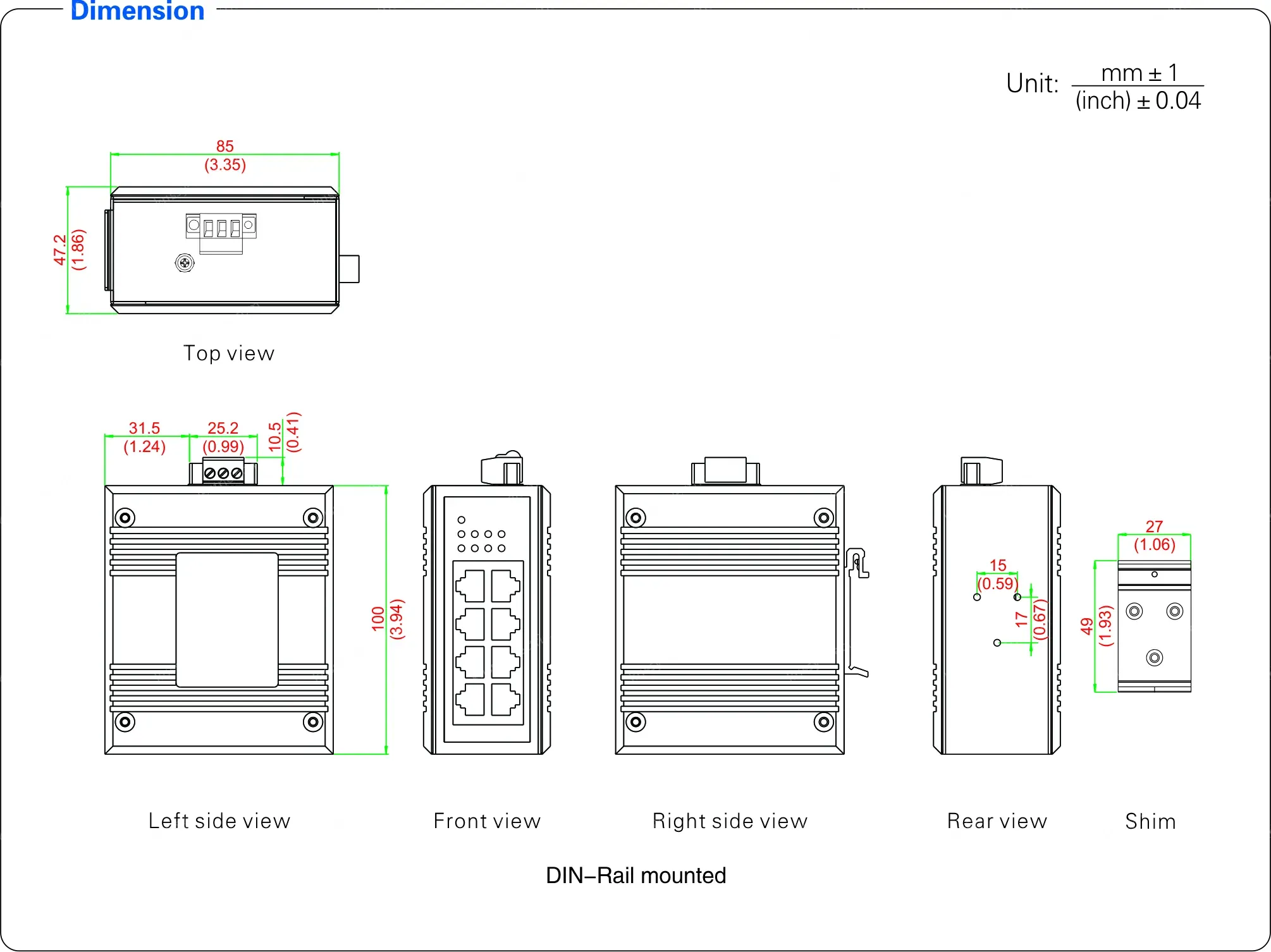 RJ45 ports: 8 10/100Base-T (X) ports, auto-detection, full/half duplex, auto MDI/MDI-X